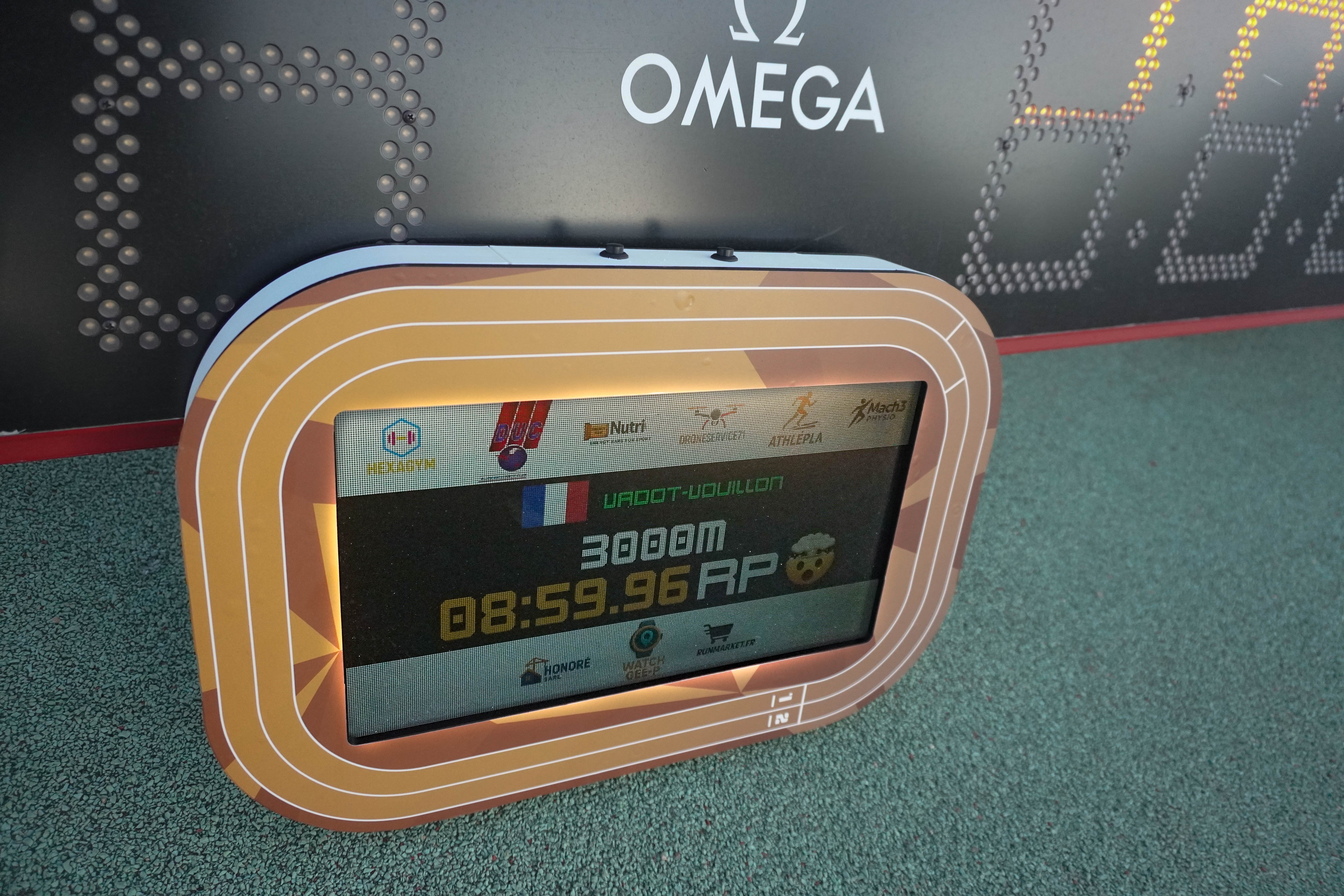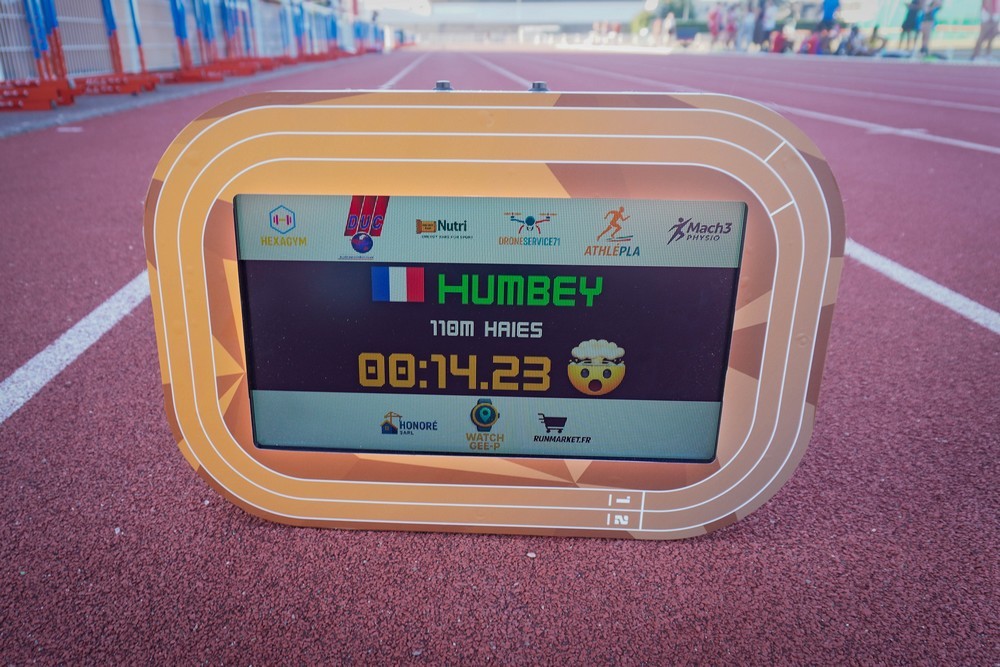 En utilisant l'application mobile ou pour ordinateur, vous décidez de ce que le TrackDisplay doit afficher : nom de l'athlète, pays, épreuve, performance réalisée, mention spéciale (record personnel, record du meeting, etc.). Cliquez, et la magie opère !